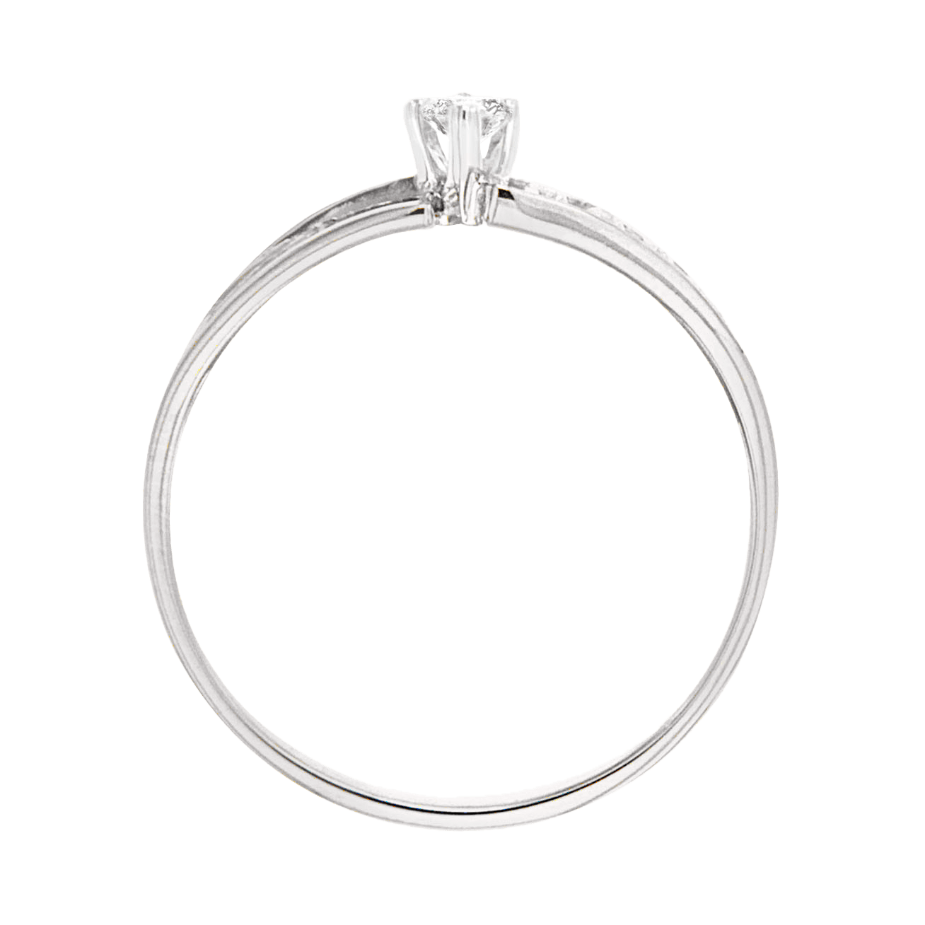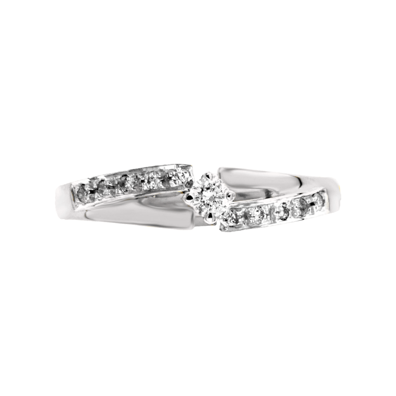 Anillo de compromiso Hands, una pieza diseñada para cautivar. Diamante central corte brillante con 6 puntos de diamante redondo acompañado por 6 puntos de diamante laterales. 12 puntos totales. Acabado brillante y platinado.