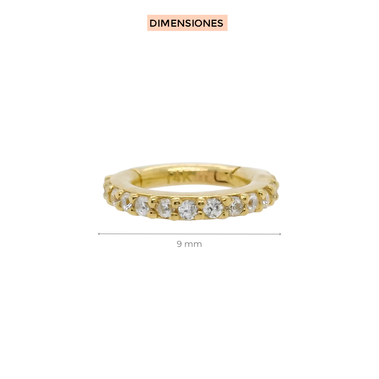 Piercing en oro de 14k. Está adornado completamente con circonias corte redondo en todo su alrededor, que capturan la luz de manera deslumbrante y crean un efecto visual armonioso y refinado, haciendo de este piercing una pieza perfecta para quienes buscan un accesorio que combine simplicidad con un toque de lujo.