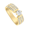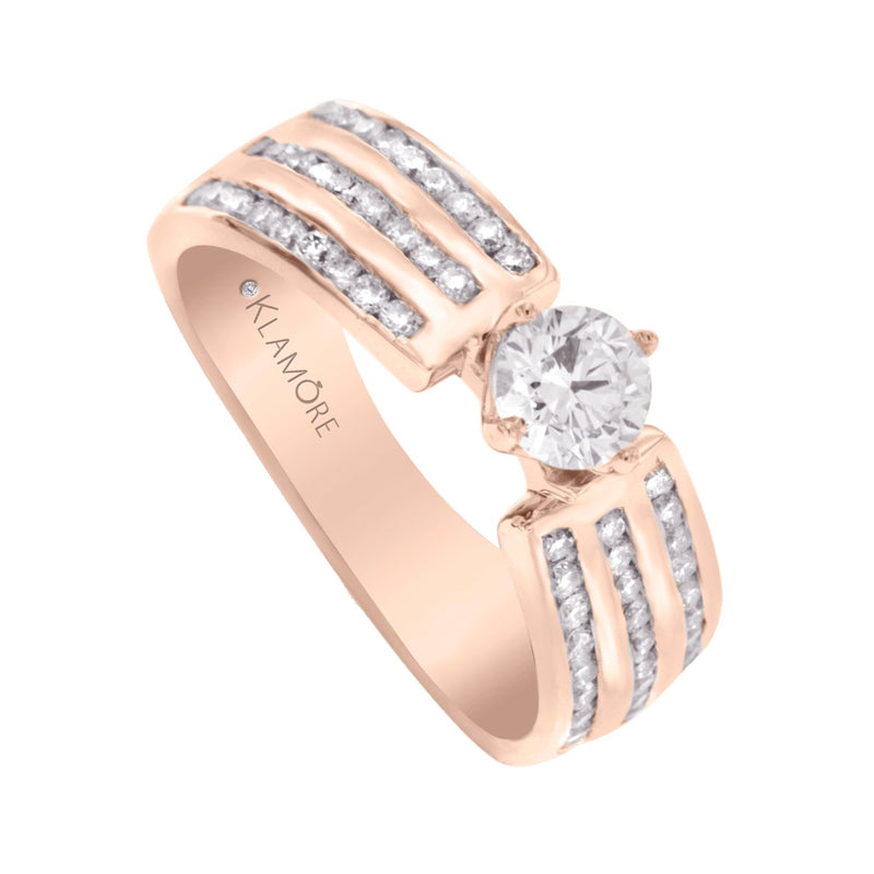 Anillo de compromiso Harriet, impactante y único. Diamante central corte brillante redondo con medio quilate (50 puntos), con tres líneas de diamantes montados a riel que realzan su belleza con 54 puntos. 104 puntos de diamante totales. Acabado brillante.