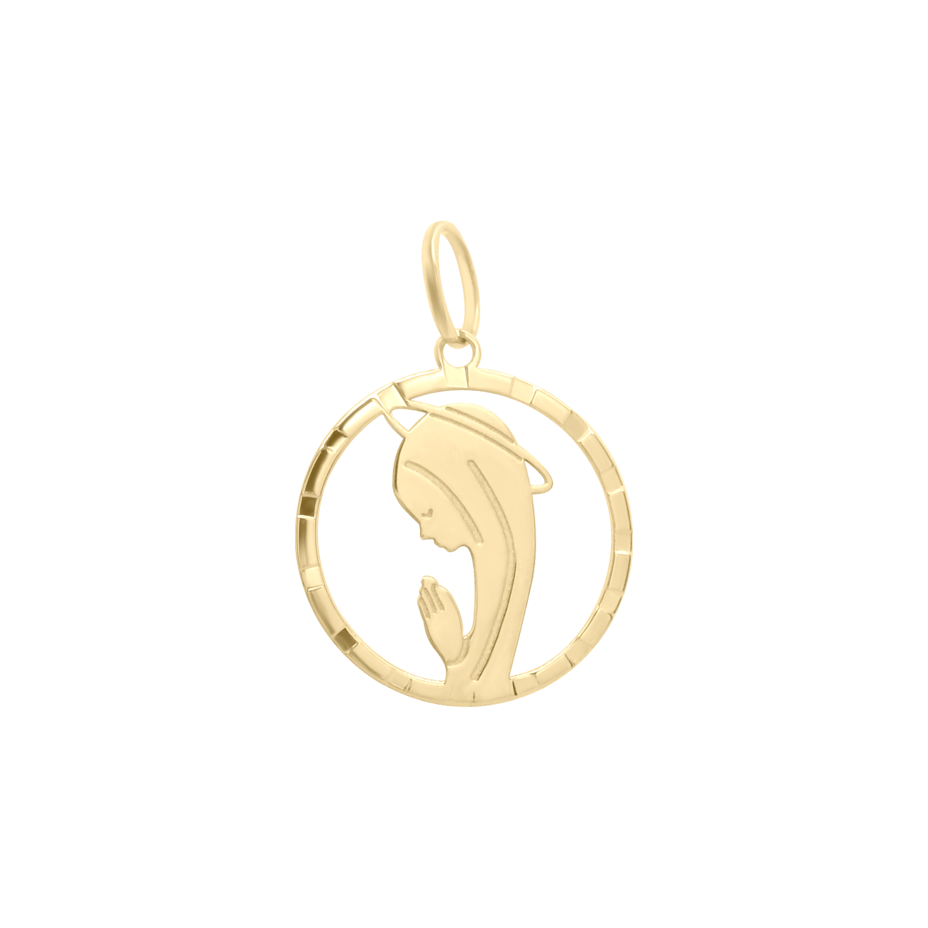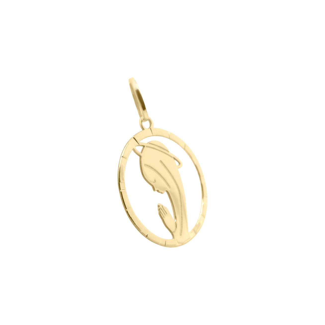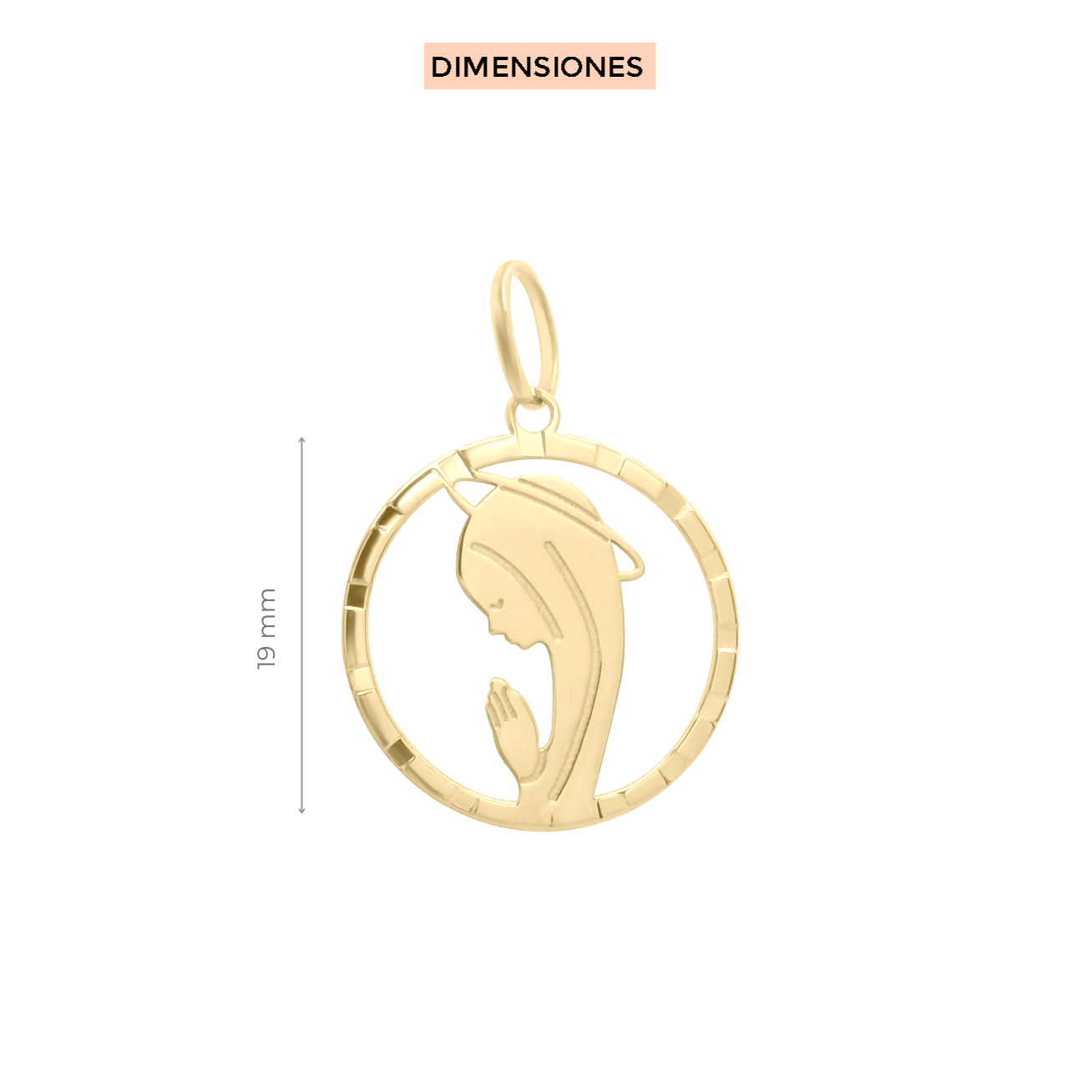Lleva contigo un símbolo de fe, pureza y protección. La medalla está enmarcada en un aro con detalles de cortes laterales que reflejan la luz desde cualquier ángulo, dándole un toque de brillo extra sin perder su sencillez.