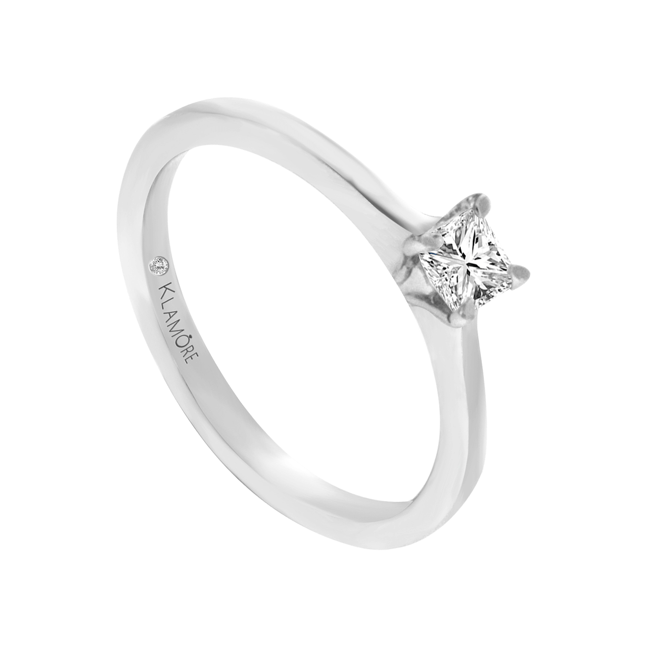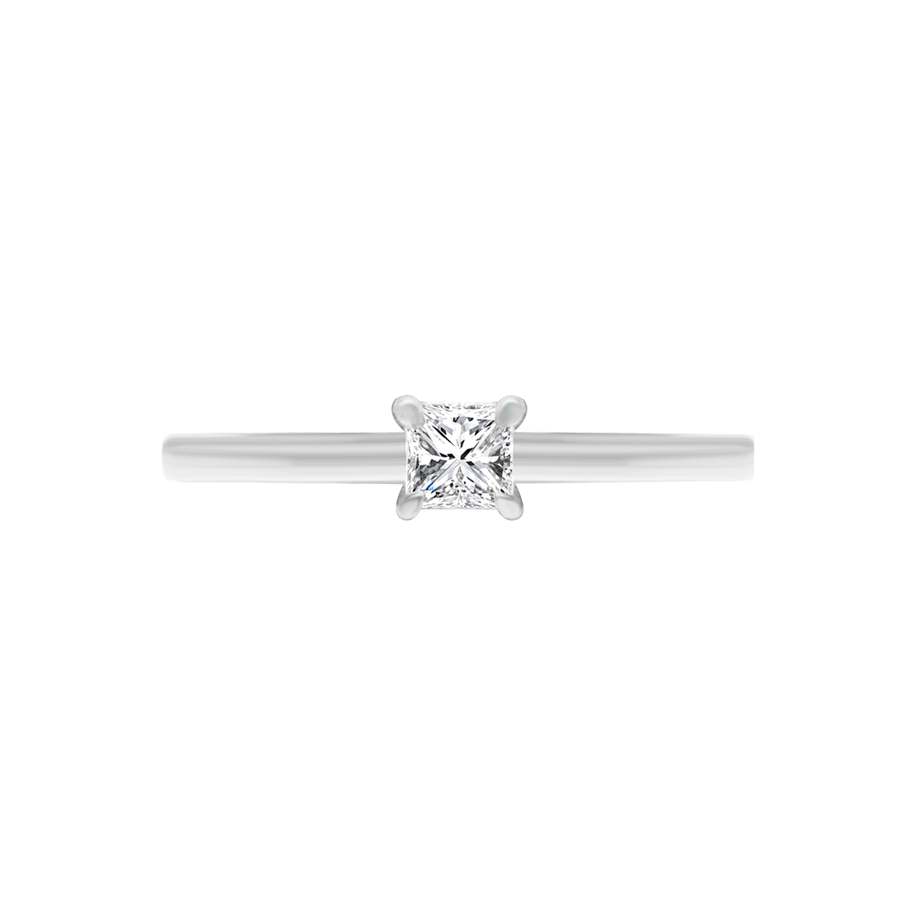 Anillo de compromiso Noa. Este delicado y radiante anillo de compromiso cuenta con un diamante al centro corte princess de 30 puntos de diamante. Acabado brillante.