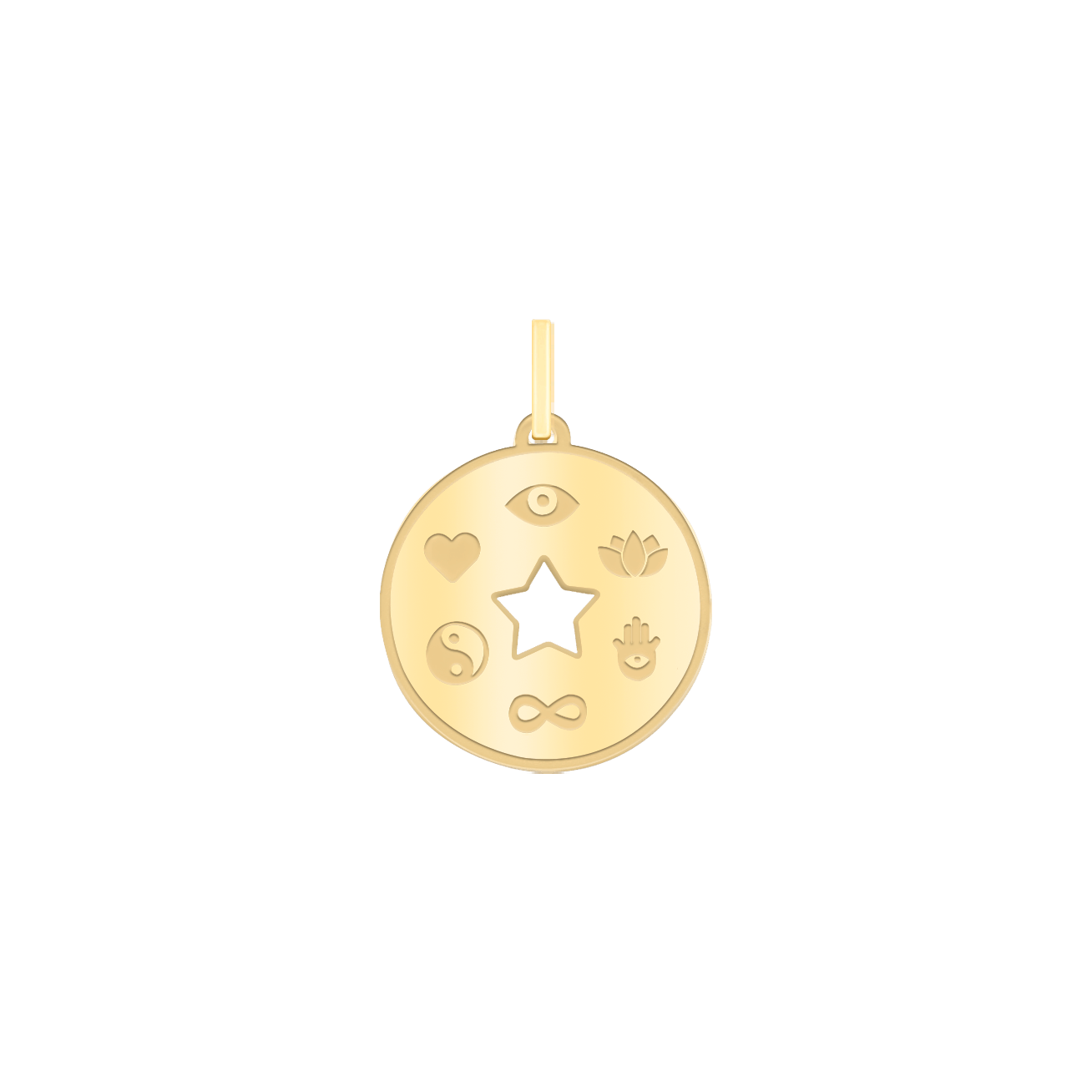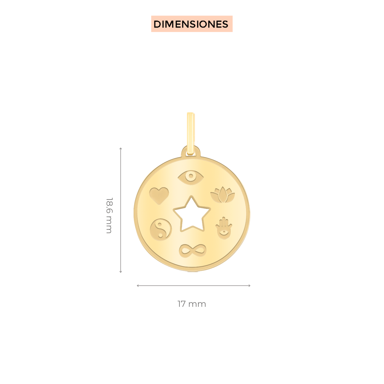 Dije Talismán Protección oro amarillo 14k acabado brillante. Este diseño se enfoca en la paz mental y la protección. Incluye el Ojo Turco, la Flor de Loto, la Mano de Fátima (Hamsa), el símbolo del Infinito y el Yin Yang. Perfecto para quienes buscan equilibrio y claridad en su camino.