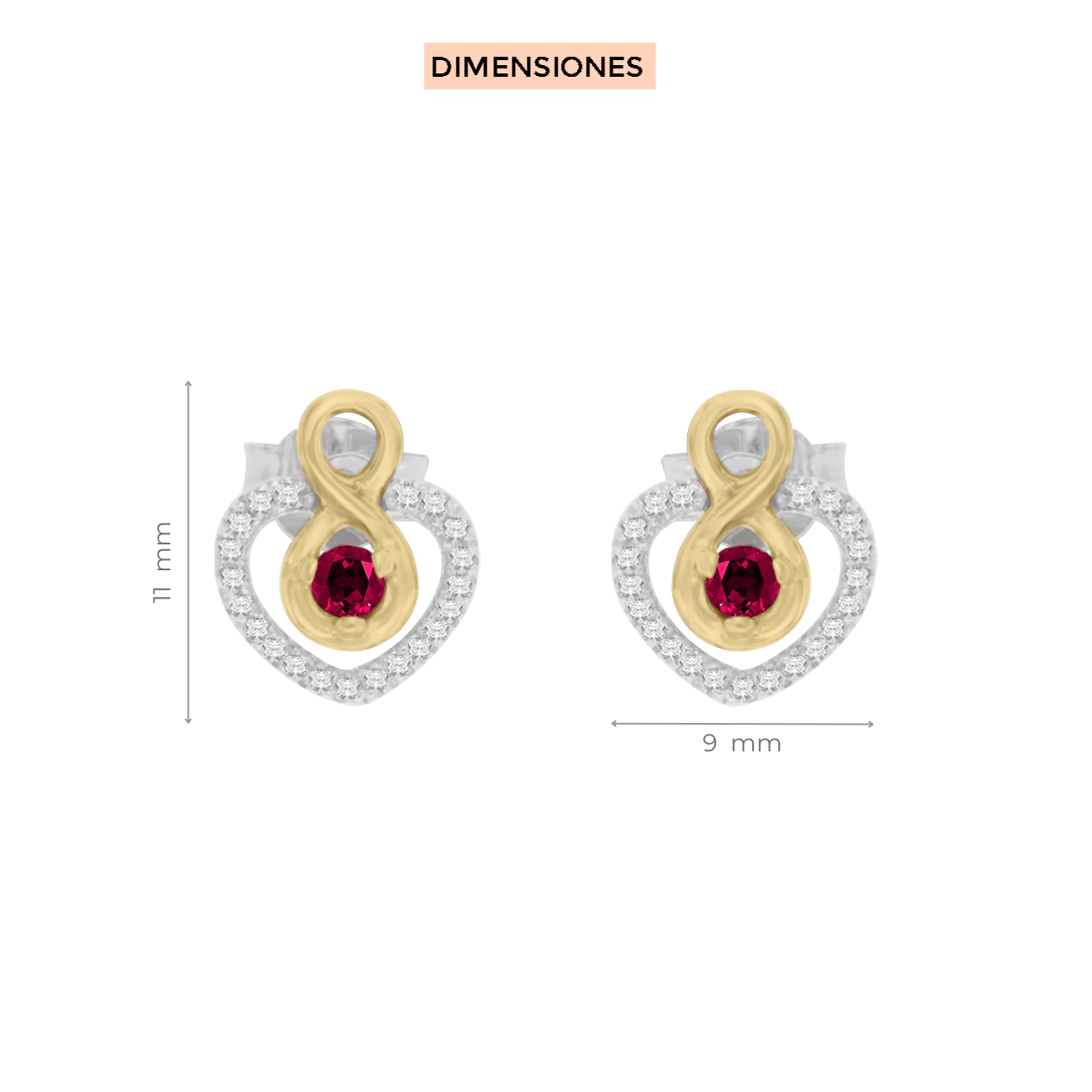 Aretes Unión de la colección Hearts of Love Diamonds® en oro combinado 14K con 9 puntos de diamante corte brillante y rubí redondo, acabado brillante.