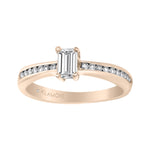 Anillo de compromiso Elias, sofisticado y singular diseño. Diamante central corte baguette de 5x3.5mm con 35 puntos de diamante, acompañado de 20 puntos de diamante laterales. 55 puntos totales. Características del diamante: Claridad SI, Color G-H. Acabado brillante y platinado.