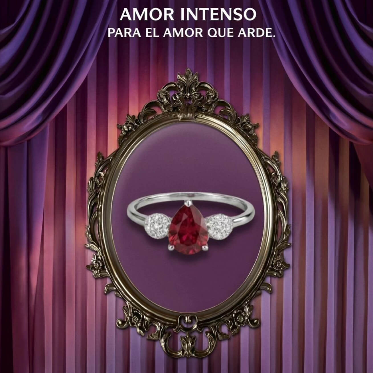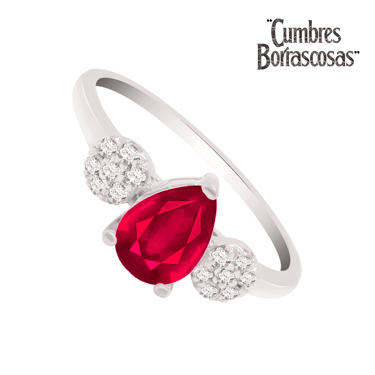 Anillo Amor Intenso con rubí natural corte pera y 14 puntos de diamante corte brillante. Acabado brillante. Diseño delicado y melancólico captura la esencia del romanticismo trágico, es la pieza ideal para representar la fragilidad y, a la vez, la fuerza de un amor que arde. Inspirado en la pelicula "CUMBRES BORRASCOSAS".