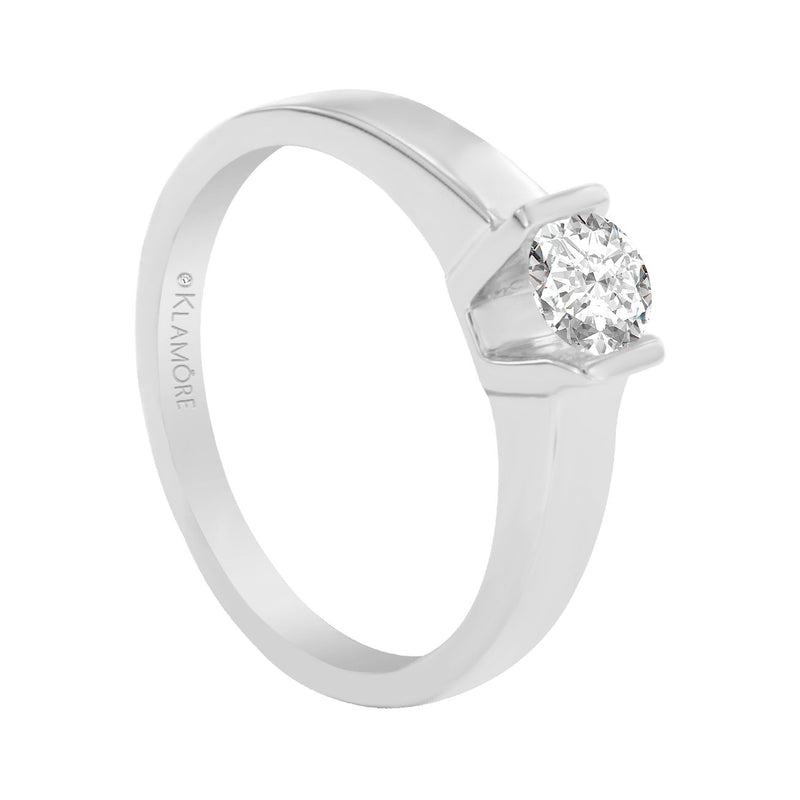 Solitario Anisa. Sella tu promesa de amor con este vanguardista diseño de lineas rectas y firmes. Diamante central corte brillante redondo con 35 puntos. Claridad SI, Color G-H. Acabado brillante.