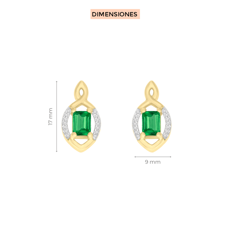 Aretes Katina, en oro amarillo de 14k con Esmeralda en corte esmeralda acompañada por 7 puntos de diamante corte brillante. Acabado brillante y platinado.