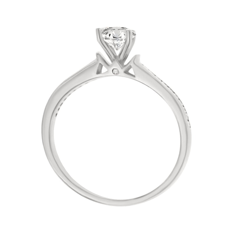 Anillo de compromiso Ilka. Ícono del amor clásico y romántico que al verlo de costado permite apreciar el culet del diamante. Diamante central corte brillante redondo 30 puntos de diamante acompañado de 11 puntos de diamante laterales. Acabado brillante.