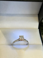 Anillo de compromiso Miloro. Diseño romántico y elegante. Diamante central corte princess con 40 puntos de diamante. Acabado brillante y uñas brillantes en rosa.
